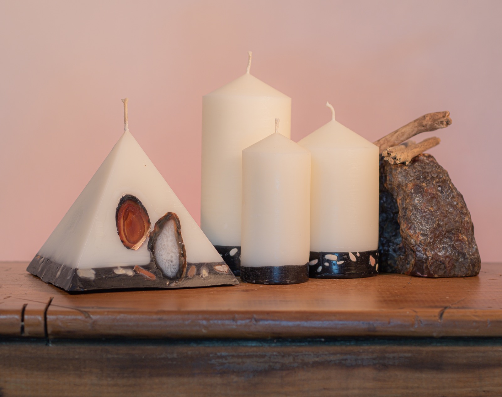 An Agate Crystal slice is embedded into one face of the Pyramid Candle.